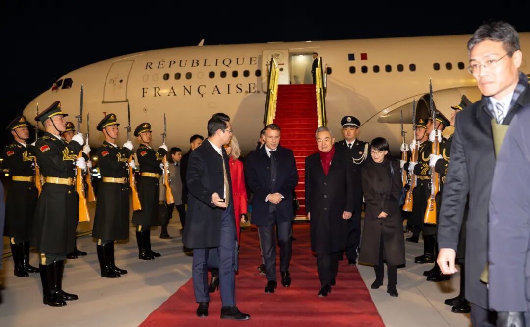 北京时�񀙓日𿾉�分,法国总统马克龙及夫人布丽吉特乘专机抵达北京首都机场,开启为期三天的访华之行。这是马克龙作为国家元首,第四次对中国进行国事访问,也是对去年中法建�周年之际中国领导人对法国进行历史性国事访问的回访。中共中央政治局委员、外交部长王毅,中国驻法大使邓励,法国驻华大使白玉堂到机场迎接。